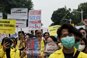 2025년 10월 20일, 인도네시아 대학생들이 쁘라보워 수비안또 대통령과 기브란 라까부밍 라까 부통령 집권 1주년을 맞아 자카르타에서 시위를 벌였다.(사진=자카르타경제신문/Aditya) 인도네시아 쁘라보워 수비안또 대통령과 기브란 라까부밍 라까 부통령의 취임 1주년을 맞아, 경제법률연구센터(CELIOS)가 쁘라보워 정