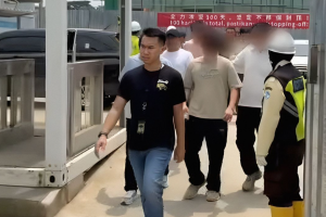 2026년 4월 8일, 서부자바 브까시 찌까랑 델타마스에 위치한 그린랜드 국제산업센터 건설 현장에서 '위라 와스빠다 작전' 중 적발된 외국인 노동자 78명을 브까시 이민국 직원(왼쪽)이 안내하고 있다. (사진=자카르타포스트/브까시 이민국) 서부자바 브까시 이민국은 불법 취업 혐의로 외국인 78명을 조사 중이라고 17일 자카르타포스트가 전했다.서부