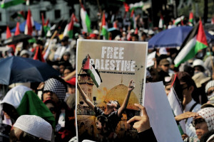 2025년 10월 12일, 팔레스타인 독립을 지지하는 무슬림들이 자카르타 모나스에 모여 하마스와 이스라엘 간의 휴전 협정을 축하했다. (사진=자카르타경제신문/Aditya)**본 내용은 자카르타포스트 1월 24일자에 게재된 전략국제연구센터(CSIS) 인도네시아 사무소의 Lina Alexandra 국제관계부장과 Pieter Pandie 연구원의 의