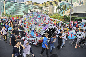 자카르타에서 일회용 플라스틱 사용 방지 캠페인이 열렸다. (사진=자카르타경제신문/Aditya) 자카르타 환경국(APA)은 수도권의 재활용 사업을 지원하기 위해 대형 생활 쓰레기 수거 서비스를 시작했다. 자카르타가 현재 가지고 있는 제한적인 쓰레기 하치장과 재활용 시설만으로는 하루 8천톤씩 쏟아져 나오는 쓰레기를