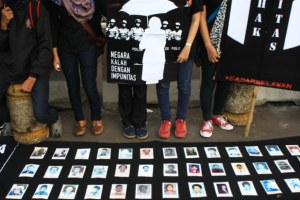 인권연합 회원들이 세계 인권의 날을 기념해 목요집회(Kamisan)에서 당시 조코 위도도 대통령에게 과거 인권 침해 사건들을 조사하고 인권 보호를 위한 법률 개혁을 촉구했다. 2015.12.10(사진=자카르타경제신문/Aditya)자카르타 행정법원(PTUN)이 1998년 5월 폭동 당시 집단 성폭행 사실을 부정하는 발언을 한 파들리 존 문화부 장관을 상대로