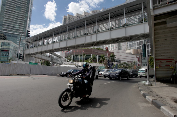 한 오토바이 운전자가 이륜차 통행이 금지된 호텔 인도네시아 로터리 인근 지역을 주행하고 있다. 사진=안따라(Antara)