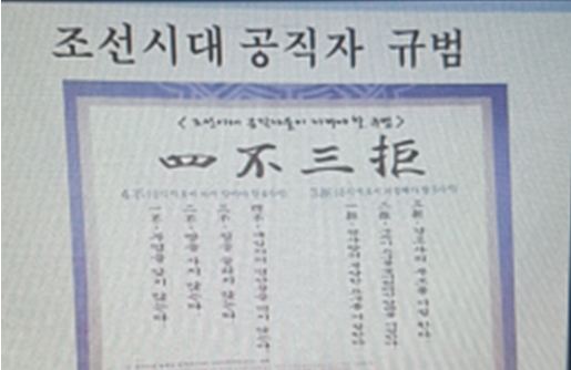 무엇이 옳은 것일까? 조선에서는 관료들이 지켜야할 규칙으로 ‘사불삼거(四不三拒)’ 라는 것이 있었다. 공무 중에 하지 말아야 할 네 가지와 거절해야 할 세 가지라는 것인데 그 내용은 아래와 같다.