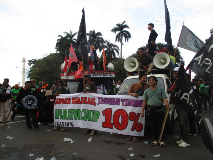 온디맨드 운전자들이 자카르타에서 플랫폼 수수료 10% 인하를 요구하며 시위를 벌였다./2025.5.20 (사진=자카르타경제신문/Aditya)
