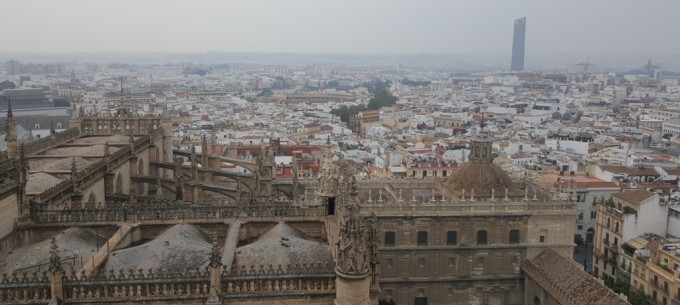 ▲ 히랄다 탑 종루에서 바라본 대성당과 시가지. 고딕양식의 특징 하중을 분산하기 위한 들보와 기둥이 사람 갈비뼈 모양으로 밖으로 돌출되어 있다.