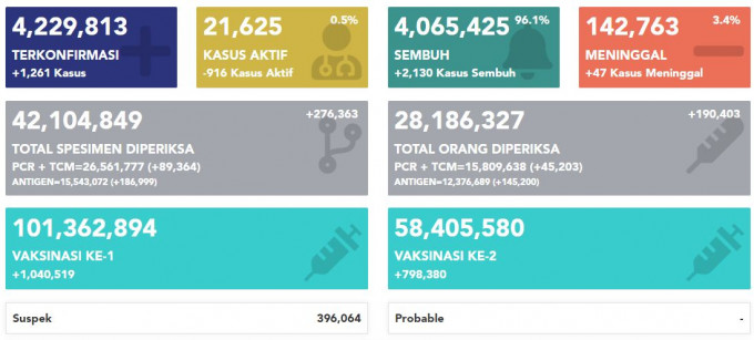 10월 12일 인도네시아 코로나19 누적확진자 4,229,813명 사망 142,763명 회복 4,065,425명으로, 신규확진자는 1,261명이 추가됐다.