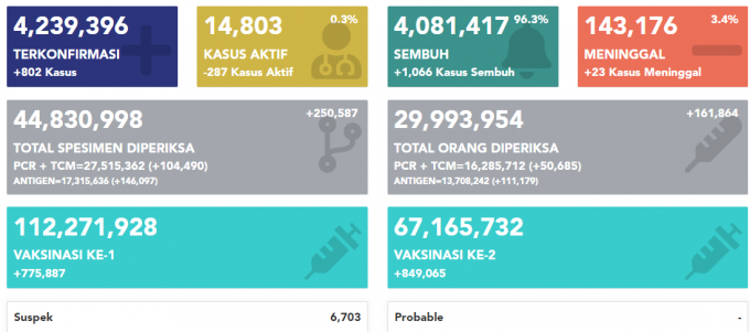 10월 23일 인도네시아 코로나19 누적확진자 4,239,396명 사망 143,176명 회복 4,081,417명으로, 신규확진자는 802명이 추가됐다.