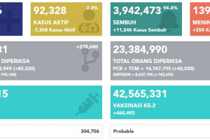 *일일확진자 발생현황(출처 https://covid19.go.id/peta-sebaran-covid19) 9월 27일 인도네시아 코로나19 누적확진자 4,209,403명 사망 141,585명 회복 4,027,548명으로, 신규확진자는 1,390명이 추가됐다. 일일사망자 수는 전날 보다 32명 많은 118명이 발생했