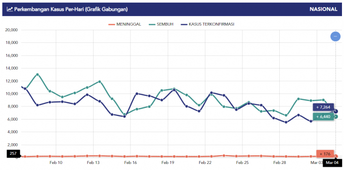 3월 4일 인도네시아 코로나19 누적확진자 1,361,098명 사망 36,897명 회복 1,176,356명으로, 전날에 비해 신규확진자가 7,264명이 추가됐고 사망자 수는 176명이 추가됐다.