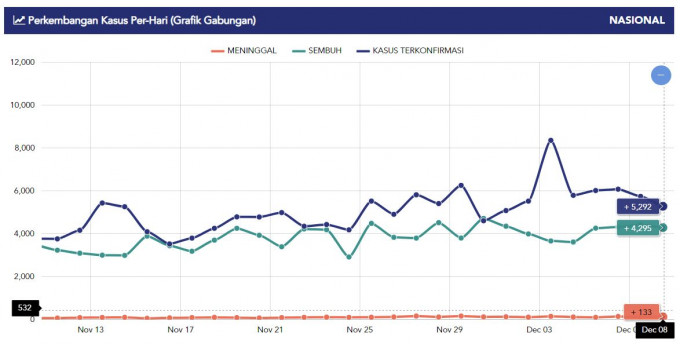 12월 8일 인도네시아 코로나19 누적확진자 586,842명 사망 18,000명 회복 483,497명으로, 전날에 비해 신규확진자 수가 5,292명이 추가됐고 사망자 수는 전날에 비해 133명이 추가됐다.