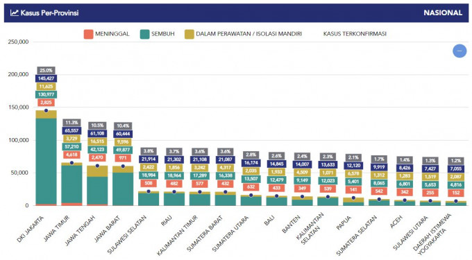 자카르타 누적확진자 146,621명 사망자 2,846명으로 가장 많은 확진자가 발생했고, 그 다음으로 동부자바 확진자 66,099명 사망 4,667명, 중부자바 확진자 61,877명 사망 2,476명, 서부자바 확진자 61,175명 사망 977명, 남부술라웨시 확진자 22,026명 사망 511명, 리아우 확진자 21,473명 사망 489명, 동부깔리만딴 확진자 21,364명 사망 614명, 서부수마뜨라 확진자 21,175명 사망 434명, 북부수마뜨라 확진자 16,261명 사망 633명, 발리 확진자 14,931명 사망자 446명, 반뜬 확진자 14,105명 사망 365명, 남부깔리만딴 확진자 13,695명 사망 543명, 파푸아 확진자 12,243명 사망자 141명 등이 발생했다.