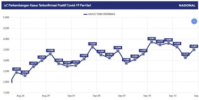 9월 15일 인도네시아 코로나19 누적 확진자 225,030명 사망 8,965명 회복 161,065명으로, 전날에 비해 확진자가 3,507명이 추가됐고 사망자는 124명이 추가됐다.