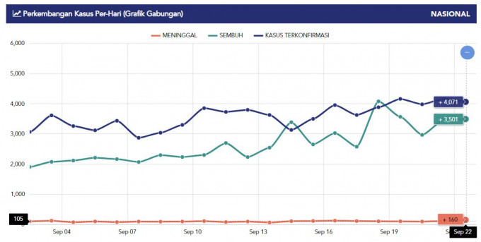 9월 22일 인도네시아 코로나19 누적확진자 252,923명 사망 9,837명 회복 184,298명으로, 전날에 비해 확진자가 4,071명이 추가되면서 전날에 이어 4천 명이 넘는 신규확진자가 발생했다.