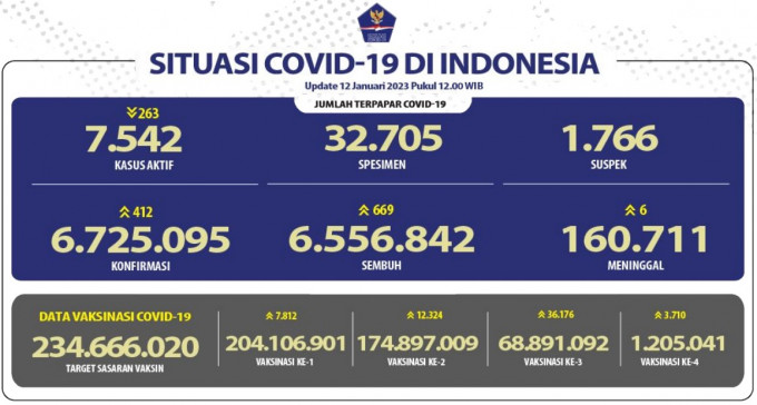 2023년 1월 12일 인도네시아 코로나19 누적확진자 6,725,095명 사망 160,711명 회복 6,556,842명으로 신규확진자는 412명이 발생했다.