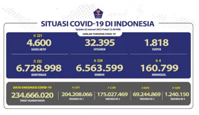 2023년 1월 26일 인도네시아 코로나19 누적확진자 6,728,998명 사망 160,799명 회복 6,563,599명으로 신규확진자는 322명이 발생했다.