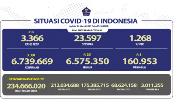 2023년 3월 14일 인도네시아 코로나19 누적확진자  6,739,669명 사망 160,953명 회복 6,575,350명으로 신규확진자는 380명이 발생했다.