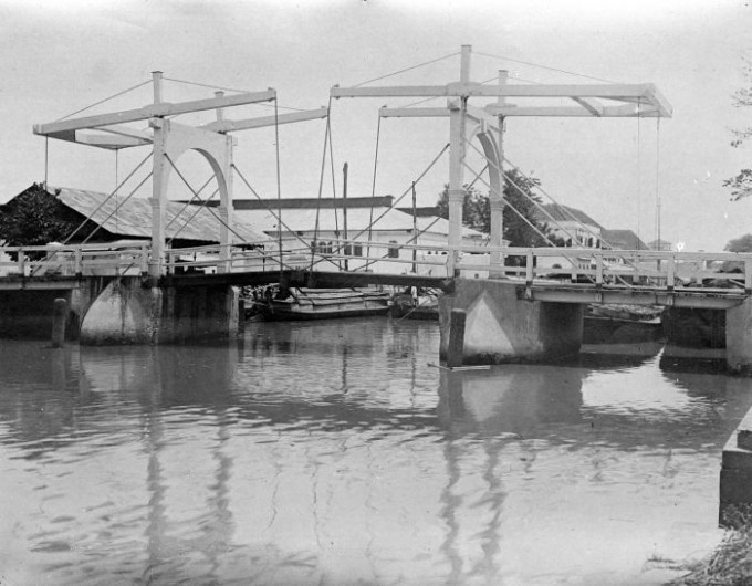 암스테르담과 비슷한 도시 디자인을 구획하고자 했던 네덜란드 동인도회사 (Vereenigde Oostindische Compagnie, VOC)는 운하와 더불어 1628년 이 도개교를 건설했다. 바타비아로 향신료를 나르는 작은 배들이 드나들 때 이 다리는 들어 올려졌다. 처음에 건설되었을 때 이 다리는 영국 요새의 근처 동쪽에 지어져 네덜란드 요새까지 연결하는 역할을 했기에 ‘영국 다리 (Engelse Brug, England Bridge)’로 자랑스럽게 소개되었다.(1628) ‘닭 시장다리 (Jembatan Pasar Ayam, 네덜란드어로 De Hoender Pasarbrug)’라고도 불렀는데(1630), 이는 다리가 닭과 채소를 파는 시장과 근접해서였다.