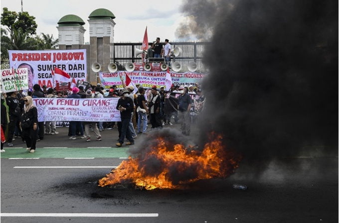 선거부정 조사를 요구하는 여러 시민단체들이 3월 3일 국회의사당 앞에 모여 타이어를 불태우며 시위를 벌였다. (사진=안따라/Galih Pradipta)