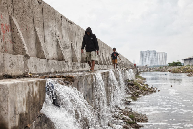 북부 자카르타 해안 방조제에 균열이 생겨 해수가 주거지로 흘러들어가고 있다.(사진=자카르타경제신문/Aditya)
