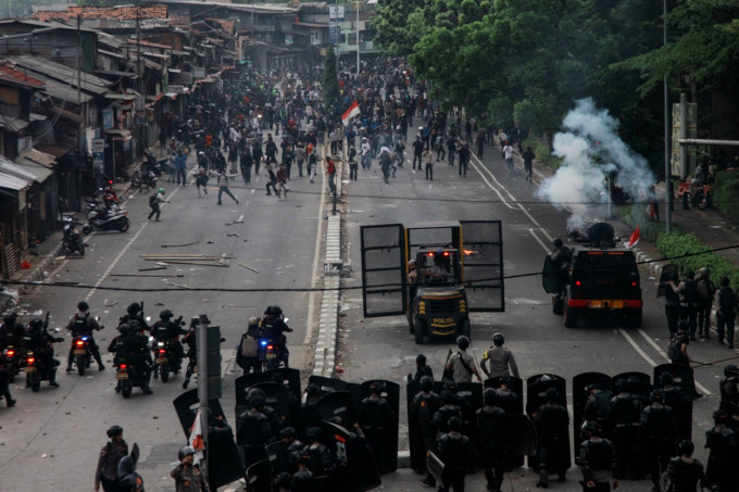 2025년 8월 25일, 사회 각계각층에서 모인 시위대가 자카르타에서 국회 하원(DPR) 해산을 요구하는 시위를 하던 중 경찰과 충돌했다.(사진=자카르타경제신문/Aditya)