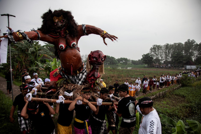 발리 힌두교인들이 녜삐 데이(Nyepi Day)를 앞두고 행하는 마지막 의식 따우르 끄상아(Tawur Kesanga) 의식에 참여하고 있다.(사진=자카르타경제신문/Aditya)
