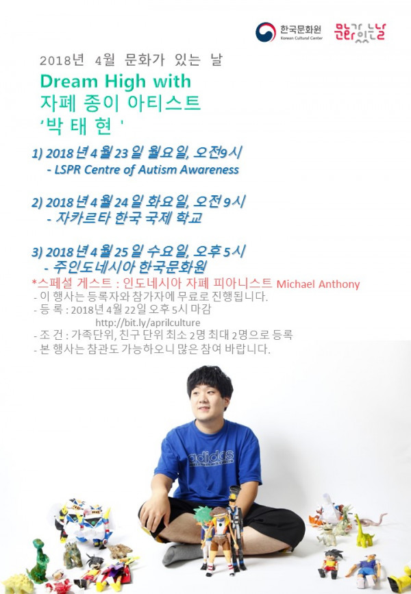 주인도네시아 한국문화원은 '4월 문화가 있는 날'을 맞이하여, '인도네시아 '를 가슴에 품고 살고 있는 한국의 자폐 종이 아티스트 '박태현' 군을 초청하여 장애 인식 개선과 이해를 위한 뜻 깊은 행사를 개최합니다.