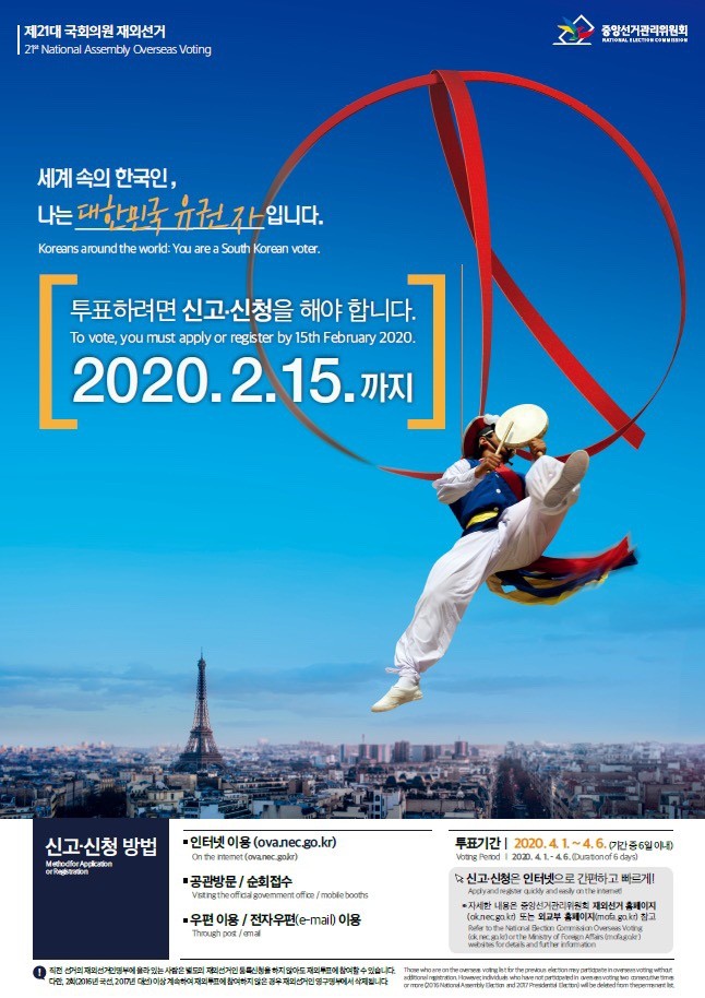 내년 2020년 4월 15일 실시되는 제21대 국회의원 선거에 참여하고자 하는 재외선거인 및 국외부재자는 선거 60일 전인 2020년 2월 15일까지 등록을 마쳐야 한다.