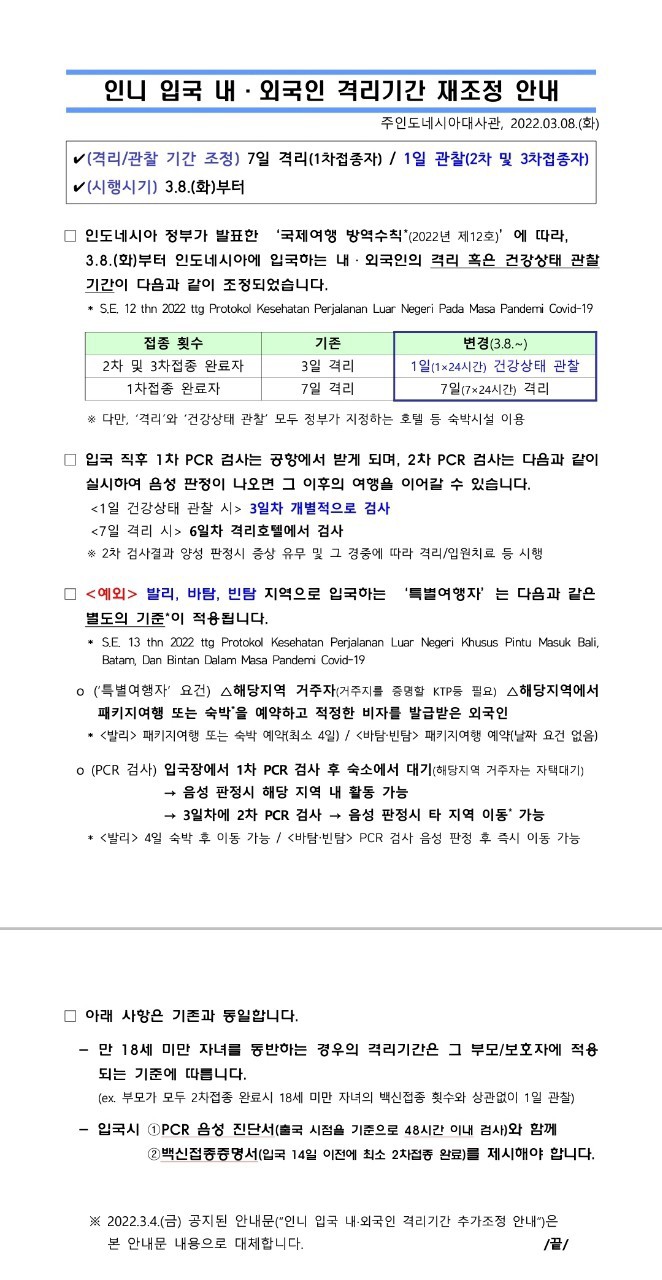공지사항 [대사관] 인니 입국 내,외국인 격리기간 재조정 안내 (3.8) 페이지 정보 작성자 편집부 댓글 0건 조회 17,866회 작성일 2022-03-08 20:16 목록 본문 이전글[대사관] 예방접종 완료자 격리면제제도 변경 예정 안내 (3.11) 22.03.11 다음글[대사관] 자바-발리 사회활동제한조치(PPKM) 연장(3.8) 22.03.08 댓글 0 댓글목록 등록된 댓글이 없습니다.