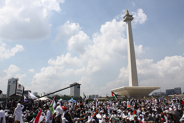 Thousands of Muslims held a rally in the National Monument yard, near the US Embassy, Jakarta, Friday, May 11, 2018. They condemned the US government that would still move its Embassy to Israel from Tel Aviv to Jerusalem. (JakartaBizWeekly/Aditya)