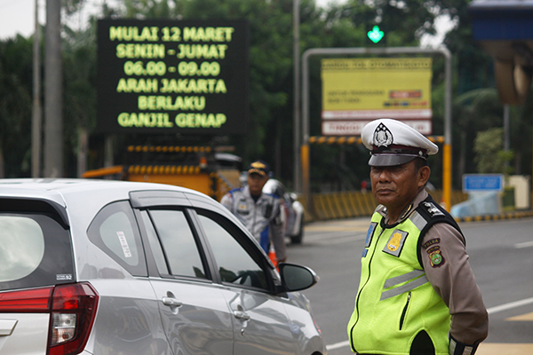 Police officers and Department of Transportation officers arranged traffic and directed the driver, while the odd-even license plate system was imposed, at the toll gate of Bekasi Barat, Bekasi City, West Java, on Monday, March 12, 2018. In an effort to overcome congestion in Jakarta-Cikampek toll road, the government imposed three regulations on the toll road section, odd-even license plate systems for private vehicles, the operational clocking of carrier transport vehicles (class III, IV, and V), and the enforcement of bus-specific lanes. All regulations apply at the toll gates of East Bekasi and Bekasi Barat to Jakarta, starting Monday - Friday, at 06:00 to 09:00 am, excluding holidays. This policy is expected to reduce congestion by up to 20%. (JakartaBizWeekly/Aditya)