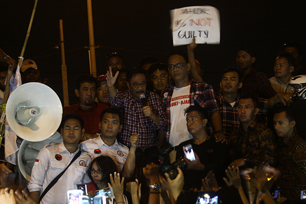 Supporters of Basuki Tjahaja Purnama or Ahok, convicted in a blasphemy case, held a demonstration in front of Cipinang prison, East Jakarta, Tuesday night, May 9, 2017. In addition to providing moral support, they asked the court to suspend Basuki's detention and make him a prisoner of the city. (JakartaBizWeekly/Aditya)