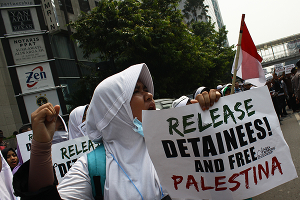 Dozens of activist from Aqsa Working Group humanitarian agencies held a solidarity action for Palestine in front of Palestine Embassy and the United Nations representative office for Indonesia, in Jakarta, on May 18, 2017. The action is in support of Palestinian prisoners in Israel who are on a hunger strike to claim their basic rights to the Israeli government, to be given access to family visits and not to be treated arbitrarily. (JakartaBizWeekly/Aditya)