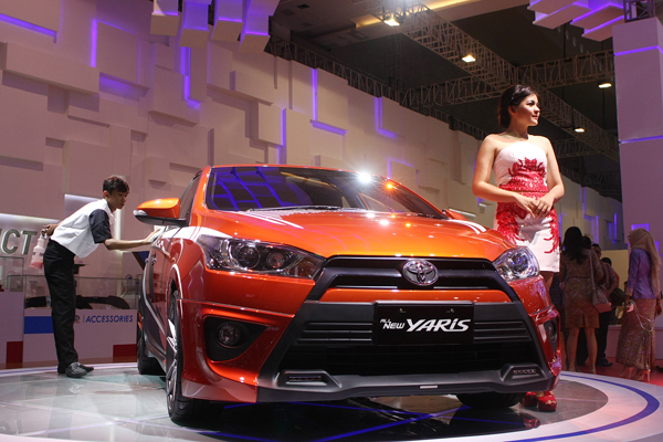 Sales promotion girl standing next of the Japanese-made car in the Indonesia International Motor Show (IIMS) 2016, which opened by Indonesia Vice President, M. Jusuf Kalla at the Jakarta International Expo (JIExpo), Kemayoran, Central Jakarta, Thursday, April 7, 2016. With a target of 380 thousand visitors and the transaction value of Rp. 2 Trillion, Jusuf Kalla hopes the IIMS 2016 will be able to push the economic growth of the automotive industry sector. IIMS 2016 will last for 10 days which starting from 7 to 17 April, 2016, with price of admission for visitors is Rp. 40,000 for Monday - Thursday and Rp 60,000 for Saturday and Sunday. The organizers also provide free bus for visitors provided in a number of pick-up points, such Grand Indonesia, Mall Kelapa Gading, Pondok Indah Mall, Central Park, Puri Indah Mall, AEON Mall BSD City, and Summarecon Mall Bekasi. (JakartaBizWeekly/Aditya)