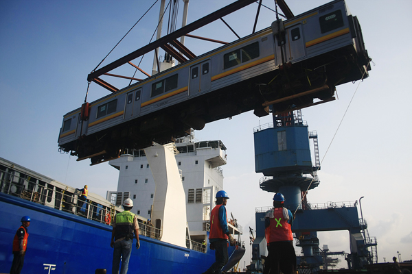 Workers move the electric train cars from the ship to piers at the Port of Tanjung Priok, Jakarta, Wednesday, December 6, 2016. The arrival of 18 electric train cars from Japan is the last wave of the electric train fleet procurement program by PT. Kereta Api Indonesia (KAI) Commuter Jabodetabek (KCJ) 2015, a total of 120 carriages. With the increase in the fleet, PT KCJ targets to serve 285.600.960 passengers in 2016, up 10.9% from the realization of passengers in 2015. (JakartaBizWeekly/Aditya)