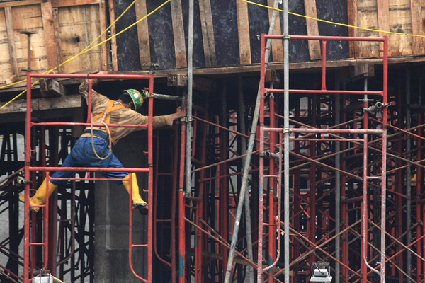 Construction workers doing construction of buildings in Jakarta, Wednesday, January 13, 2016. Within facing AEC, Minister of Labour of the Republic of Indonesia, Hanif Dakhiri asserted, each company was asked to implement a Safety and Health Management System (SMK3) in the work environment in order to give protection to the workforce in addition to providing wage protection, social security, freedom of association, and labor relations. (JakartaBizWeekly/Aditya)
