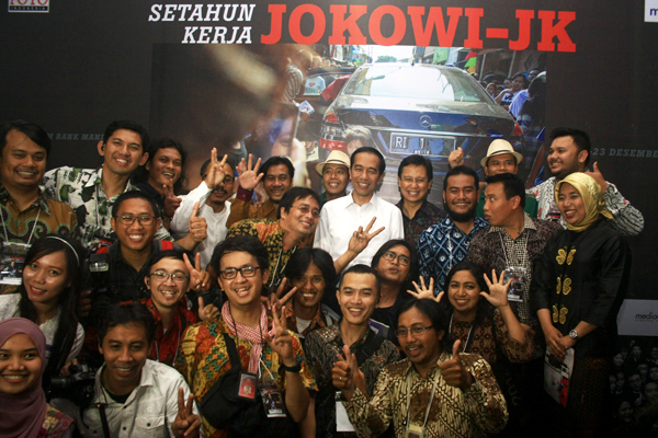 President Joko Widodo (center) during a photo session with photo journalists, after inaugurating the opening of the  Photojournalistic exhibition themed "ONE YEAR OF WORK JOKOWI - JK" in the Museum Bank Mandiri, Jakarta, Friday, December 18, 2015. The exhibition featuring 83 photographs of a number of the Indonesian photojournalists, told about portrait activity of President Joko Widodo (Jokowi) and Vice President Jusuf Kalla (JK) and a number of ministers of "Kabinet Kerja" for one year since the inauguration of Jokowi and JK. (JakartaBizWeekly / Aditya)