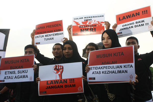 Members of Coalition of Human Rights (HAM) Day brought the attributes of human right during demonstration in the event Kamisan to 423 in commemoration of World Human Rights (HAM) Day in front of the State Palace, Jakarta, Thursday, December 10, 2015. The action they did to ask President Joko Widodo kept his promise in investigating of past human rights cases and stop the weakening towards the KPK as well as the reform of legislation in order to truly protect human rights. (JakartaBIzWeekly/Aditya)