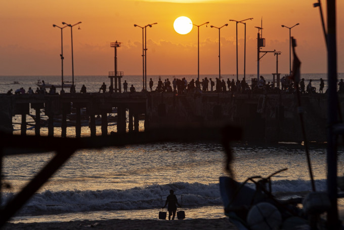 2025년 9월 26일, 발리 바둥 끄동아난 해변에 위치한 끄동아난 어시장에서 어부들과 생선 상인들이 아름다운 노을을 배경으로 고요한 오후를 보내고 있다.