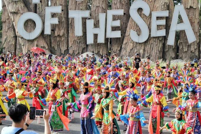 2025년 10월 25일, 자카르타 안쫄 드림랜드에서 열린 2025 인도네시아 국제문화축제 첫날, 수천 명의 무용수들이 "난다끄 온델온델(Nandak Ondel-ondel)" 춤을 선보이고 있다.