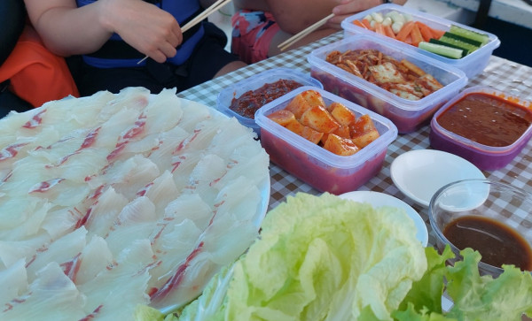 선상 : 컵라면, 맥주, 음료, 생수, 김치. 초고추장, 간장과 와사비, 마늘, 양파, 고추, 상추 제공