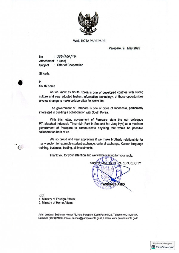 인도네시아 술라웨시섬에서 가장 큰 도시인 마카사르에서 북쪽으로 약 3시간 차로 이동하면 해안 지역에 위치한 파레파레시에 도착합니다. 파레파레시는 경제 성장, 인적 자원 역량 강화, 무역 및 관광 분야의 발전을 위한 국제 협력 네트워크를 지속적으로 확대하고 있는 도시입니다. 파레파레 시장으로 2025년 초 선출되어 앞으로 5녀간의 임기 기간 중에 한국과의 교류를 적극적으로 희망하며, 한국 관련 업무를 전담할 공식 대표로 우리 회사를 임명하여 파레파레시 명의의 공식 위임장을 발급했습니다. 다만 파레파레시는 한국과의 거리가 멀고, 현지에서 바로 사업화하기 적합한 산업 기반도 충분하지 않기 때문에 협력 추진이 쉽지 않은 지역이라는 평가도 있습니다.